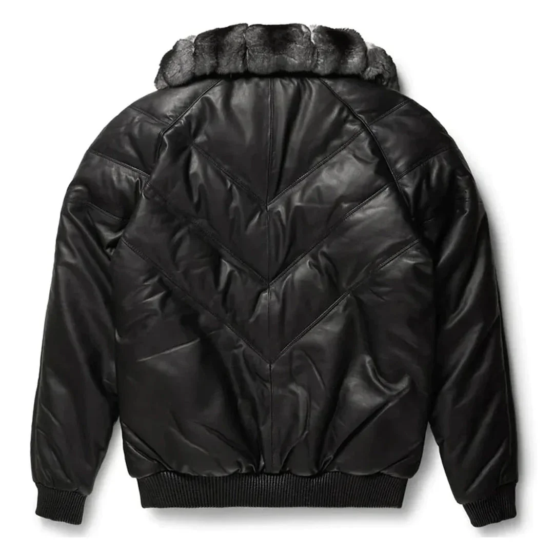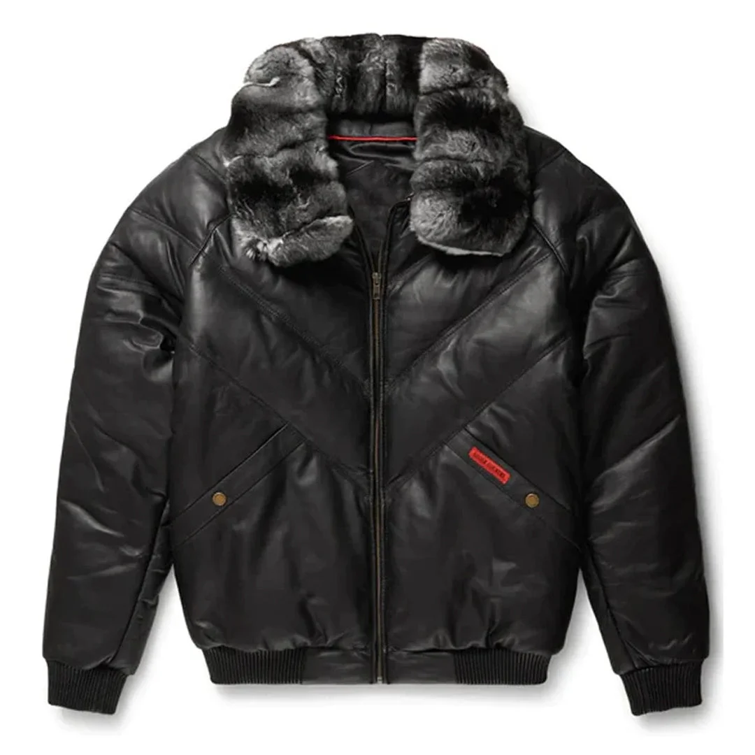 Black V-Bomber Full Faux Fur Collar Leather Jacket